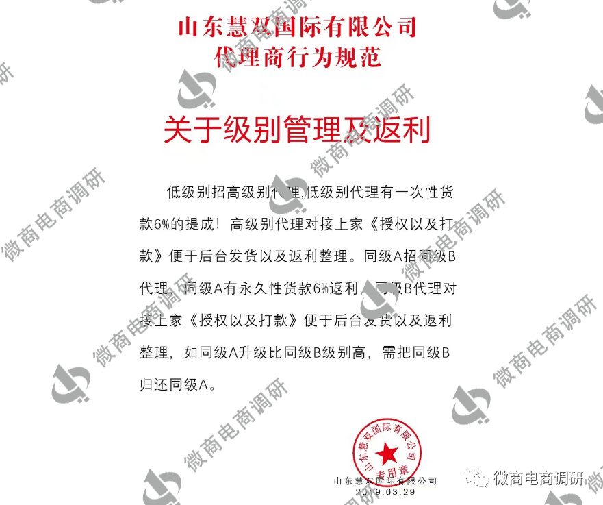成为慧双国际的代理商便有返利可拿,低级别招高级别代理,低级别代理有一次性货款6%的提成,高级别代理对接上家授权以及打款,便于后台发货以及返利整理。同级别A招同级B代理,同级A有永久性货款6%的返利,同级B代理对接上家授权以及打款,便于后台发货以及返利整理,如同级A升级比同级B的级别高,需要把同级B归还同级A。