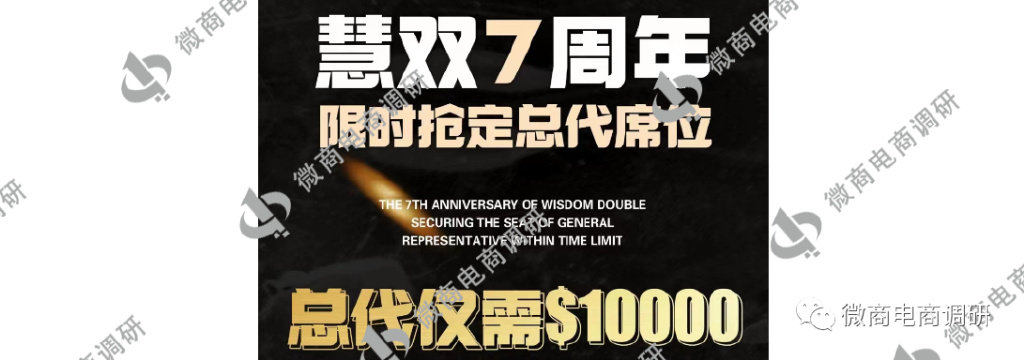 眼下,虽然产品的总经销已经变成了江西未来药业,但爱恋初系列产品的代理商依然以慧双国际的背景进行宣传,不久前,在“慧双7周年”的活动期间,平台还推出了总代门槛仅需一万元的政策。