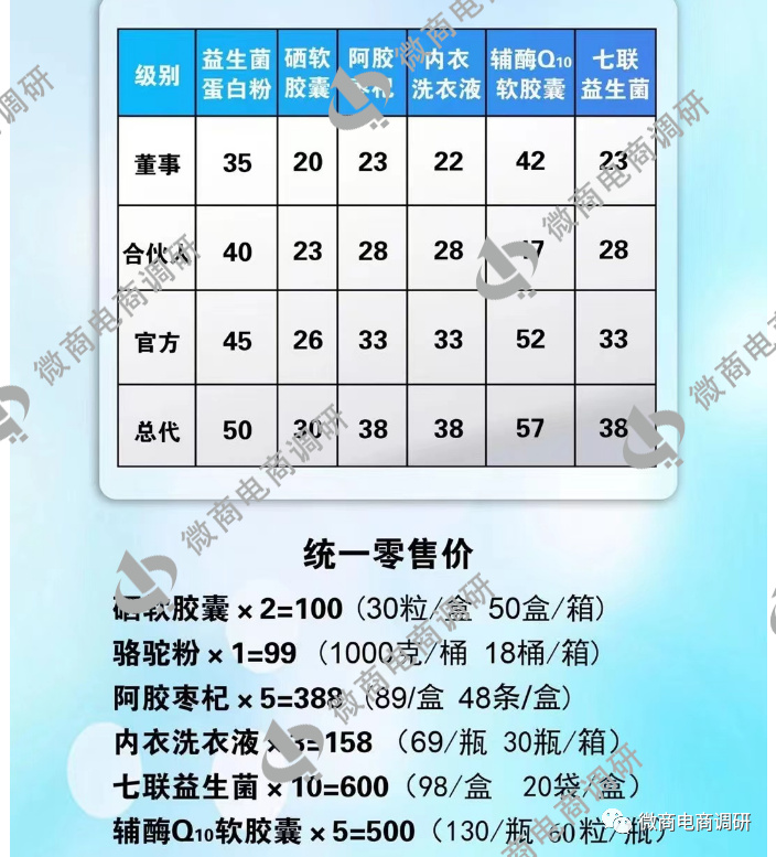代理板块包含四个职级,从低到高,分别是门槛为1.5万的总代、门槛为7万的官方、门槛为20万的合伙人,以及门槛为50万的董事。不同级别的拿货价自然不同,我们以凝胶为例,总代的拿货价为87元,官方的拿货价为75元,合伙人的拿货价为65元,董事的拿货价为55元。