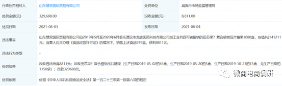 不过好景不长,当时间来到2021年8月,该公司便收到了威海市市场监督管理局开出的罚单,决定书文号:威市监食行处字﹝2021﹞32号。据相关处罚决定书显示,山东慧双国际贸易有限公司自2019年5月至2020年6月委托清远市龙唐医药科技有限公司加工含有匹可硫酸钠的田芯果复合植物压片糖果1080盒,货值共计41211元;当事人在未办理《食品经营许可证》的情况下,销售上述食品979盒,获利8811元。威海市市场监督管理局对该公司作出处罚如下:没收违法所得8811元;没收田芯果复合植物压片糖果(生产日期2019-05-02的43盒、生产日期2019-05-20的5盒、生产日期2019-10-23的15盒、无生产日期的1150袋);罚款329688元。