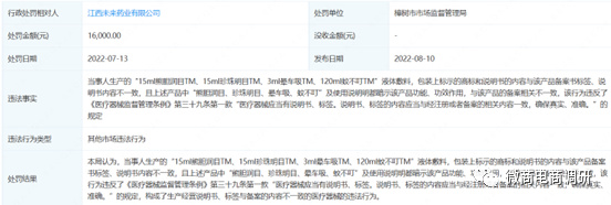 无独有偶,2022年7月,江西未来药业有限公司也曾遭到过市场监管部门的处罚。决定书文号:樟市监器械处罚〔2022〕6号。