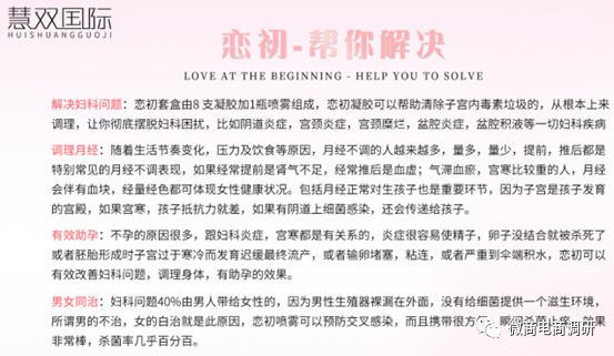 但在官方宣传材料当中,恋初系列产品却被包装为可以包治百病,原文为:“恋初凝胶可以帮助清除子宫内毒素垃圾,从根本上来调理,让你彻底摆脱妇科困扰,比如阴道炎症、宫颈炎症、宫颈糜烂、盆腔炎症、盆腔积液等一切妇科疾病”、“恋初可以有限改善妇科问题,调理身体,有助孕的效果”。