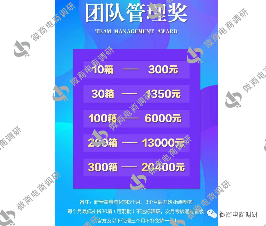 接下来,我们再来关注一下慧双国际推行的奖金制度该如何解读。据推广人员阿强(化名)提供的资料显示,慧双国际(如今也可以理解为是江西未来药业有限公司)将参与者分为了顾客和代理商两大板块,顾客板块分为零售顾客、体验顾客、初级VIP、中级VIP、高级VIP等五个级别,虽说是“顾客”,但还是存在拿货量、拿货价的差异。比如零售价1盒为268元的产品,体验顾客的门槛是598元,拿货量为3盒;初级VIP的门槛是880元,拿货量为6盒;中级VIP的门槛为2340元,拿货量为18盒;高级VIP的门槛为3300元,拿货量为30盒。