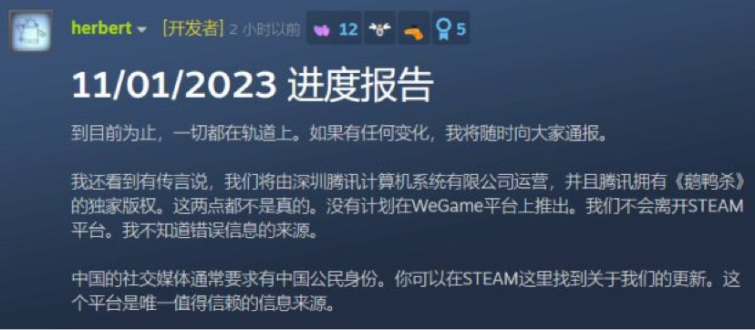 近日有传闻称腾讯将代理《鹅鸭杀》,对此《鹅鸭杀》开发者表示,腾讯代理《鹅鸭杀》传闻不实,没有计划离开Steam平台。