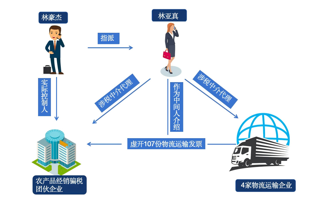 对此,检查人员依法询问林亚真,在一系列有力证据前,林亚真承认,自己受骗税团伙企业实际控制人林豪杰指使,利用作为4家物流运输企业涉税中介的便利,为骗税团伙搭建虚假物流链条,在其中负责传递发票信息、协调资金流转,帮助虚开物流运输发票。