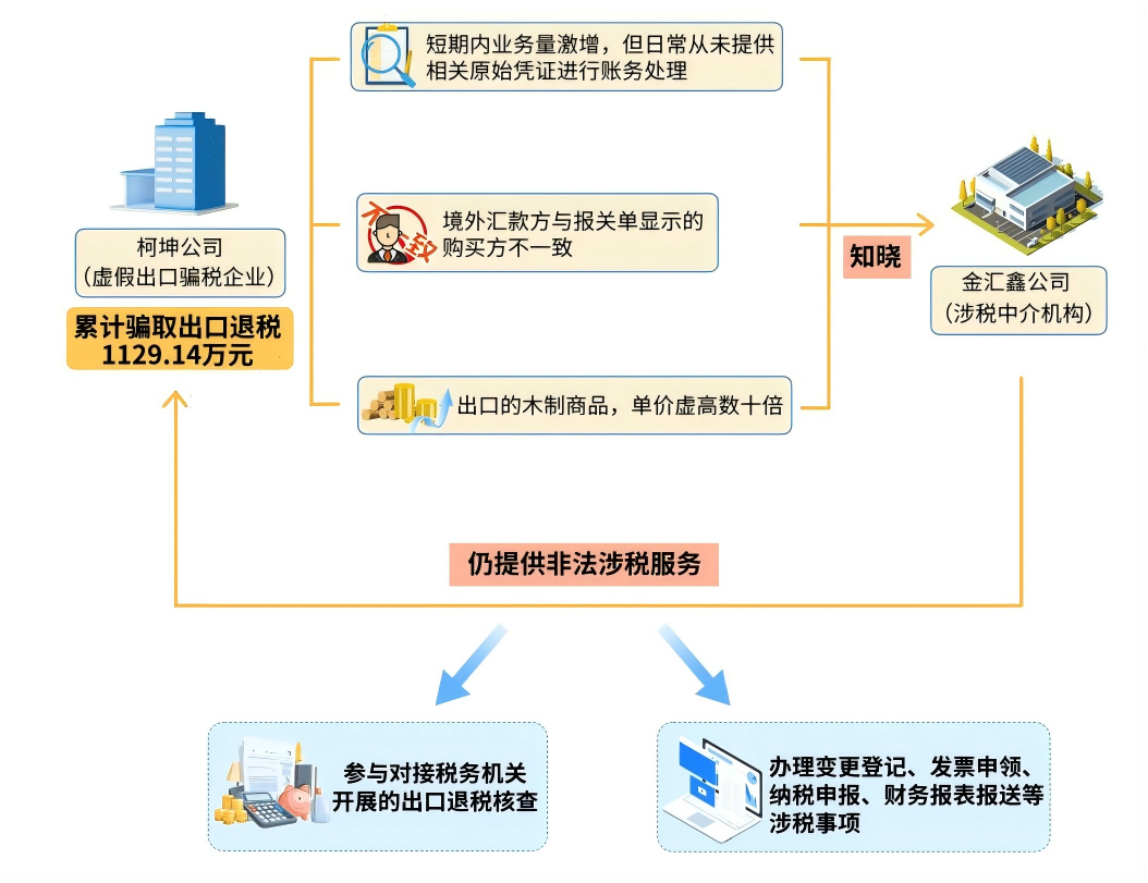 经查实,柯坤公司在2023年8月至2024年4月期间共计骗取出口退税1129.14万元,金汇鑫公司自2023年8月起为柯坤公司提供代理记账等涉税服务。金汇鑫公司及其实际控制人赖昌锻、法定代表人陈龙在明知柯坤公司实施骗取出口退税违法犯罪的情况下,不仅未履行法定的监督、报告义务,却选择了放任自流,成为骗税分子的帮凶,最终导致了国家出口退税款的流失。