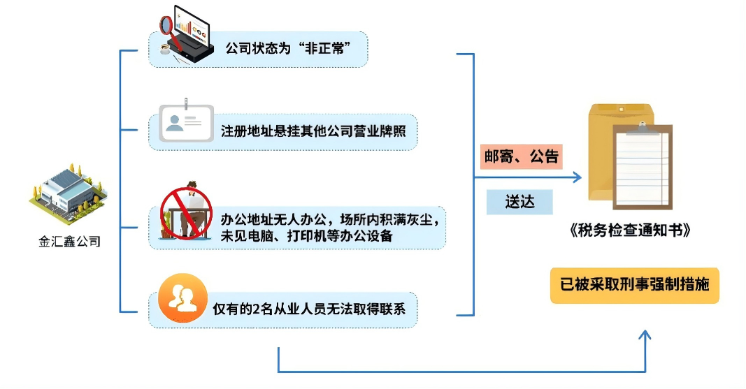 实地走访无果后,检查人员多次电话联系陈龙和赖昌锻,均无法取得联系。检查人员依法采取邮寄和公告方式向该公司送达了《税务检查通知书》。随后,经公安机关告知,检查人员得知赖昌锻、陈龙两人因涉“柯坤公司骗税案”已被采取刑事强制措施。
